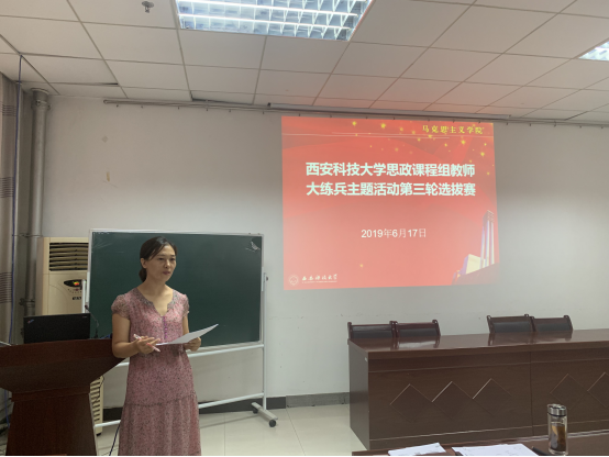 第三轮选拔赛邀请了全国高校思政课教学能手、2018年度陕西省高校思政课教师“大练兵”标兵、西北大学苟昭赟老师担任评议组组长,我校9名思政课教师参加了选拔赛。评委从参赛教师的选题入手,围绕思政课讲课比赛如何凝神聚气和发力,对参赛教师的参赛素材取舍、多媒体课件、肢体语言、表述方式等方面进行了全面点评和指导。
