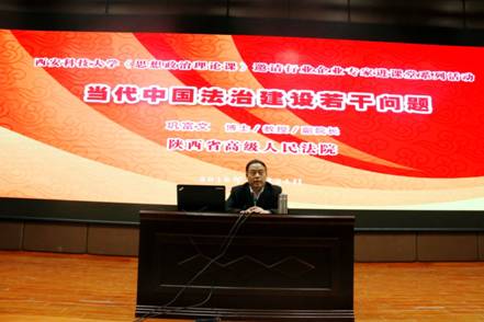 为了拓展校内外思想政治教育资源,形成思想政治教育合力,我校教务处和开云kaiyun官方网站启动了邀请行业企业专家进课堂等系列活动。邀请地方党政领导干部、企事业单位负责人、社科理论界专家、各行业先进模范以及名师大家和专业课骨干教师、思想政治教育骨干等专家上讲台讲思政课,发挥专家在政治、工作经验、人生阅历等方面的优势和特长,推动青年学生更好地了解世情、国情、党情、社情、民情,增强青年大学生的中国特色社会主义道路自信、理论自信、制度自信和文化自信,推动我校学生自觉把个人理想追求融入到国家和民族的事业之中、勇做走在时代前列的奋进者、开拓者。开云kaiyun官方网站邀请了陕西省高级人民法院副院长巩富文教授为近600名师生讲授了“当代中国法治建设若干问题”。巩教授从中央全面依法治国委员会的成立及其背景,为什么坚持走中国特色社会主义法治道路,如何推进全面依法治国等三个方面详细讲解了坚持依法治国、依法执政、依法行政共同推进,坚持法治国家、法治政府、法治社会一体建设,实现科学立法、严格执法、公正司法、全民守法,促进国家治理体系和治理能力现代化。