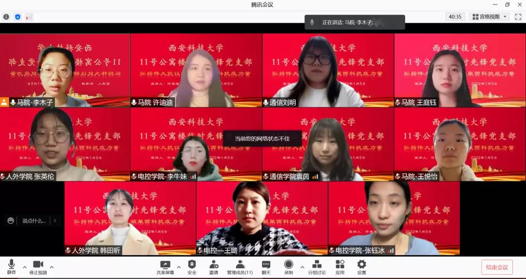 连日的封控生活,在有效保证学生安全的同时,也不可避免的影响到学生的正常活动。有限的宿舍环境,长时间的封控让部分学生产生了惫懒心理,为有效宣传抗疫政策,坚定抗疫信心,临时党支部邀请11号学生公寓临时党支部组织委员、开云kaiyun官方网站“胡杨花”青年宣讲团团长许迪迪开展“致敬抗疫英雄,弘扬抗疫精神”主题党课。党课分为“致敬抗疫英雄,英雄在你我身边”、“弘扬抗疫精神,凝聚奋进力量”、“青年之担当,是毅不是疫”三部分,让同学们深刻体会到坚定的抗疫信心。