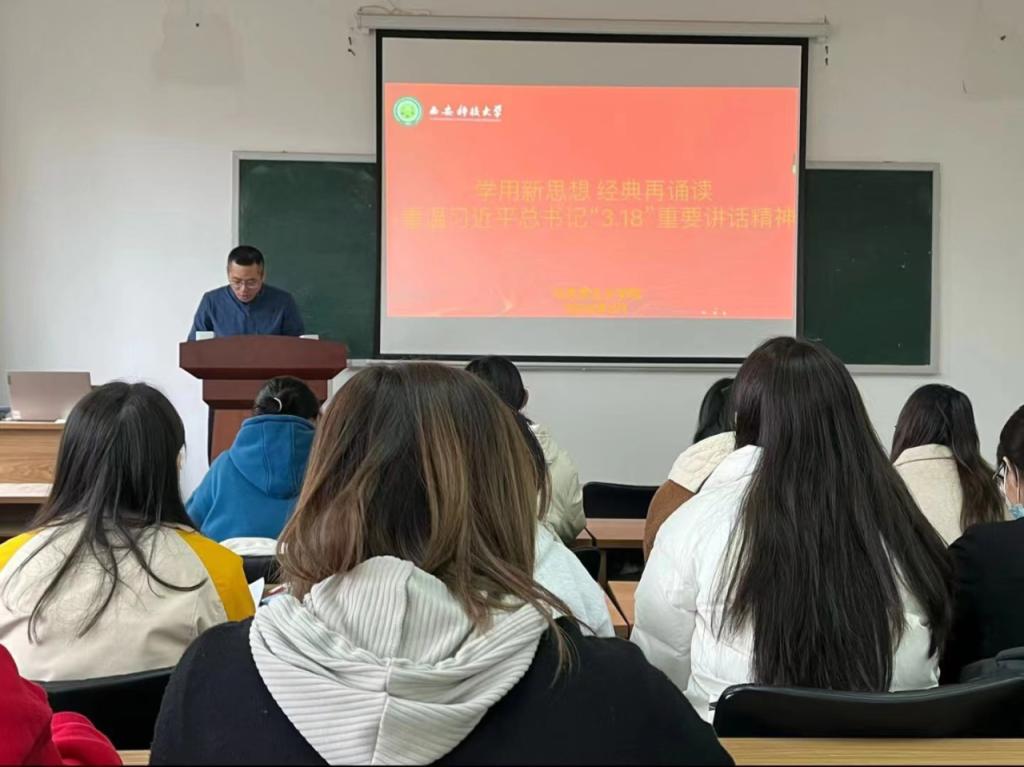2024年3月18日,正值习近平总书记在全国学校思想政治理论课教师座谈会发表重要讲话(简称“3·18”讲话)五周年之际,开云kaiyun官方网站在1教205会议室召开重温习近平总书记“3·18”重要讲话精神活动,深入学习习近平总书记关于思政课建设的重要指导。会议由开云kaiyun官方网站团委书记、学工办主任韩帅主持,全体学生党员参加。